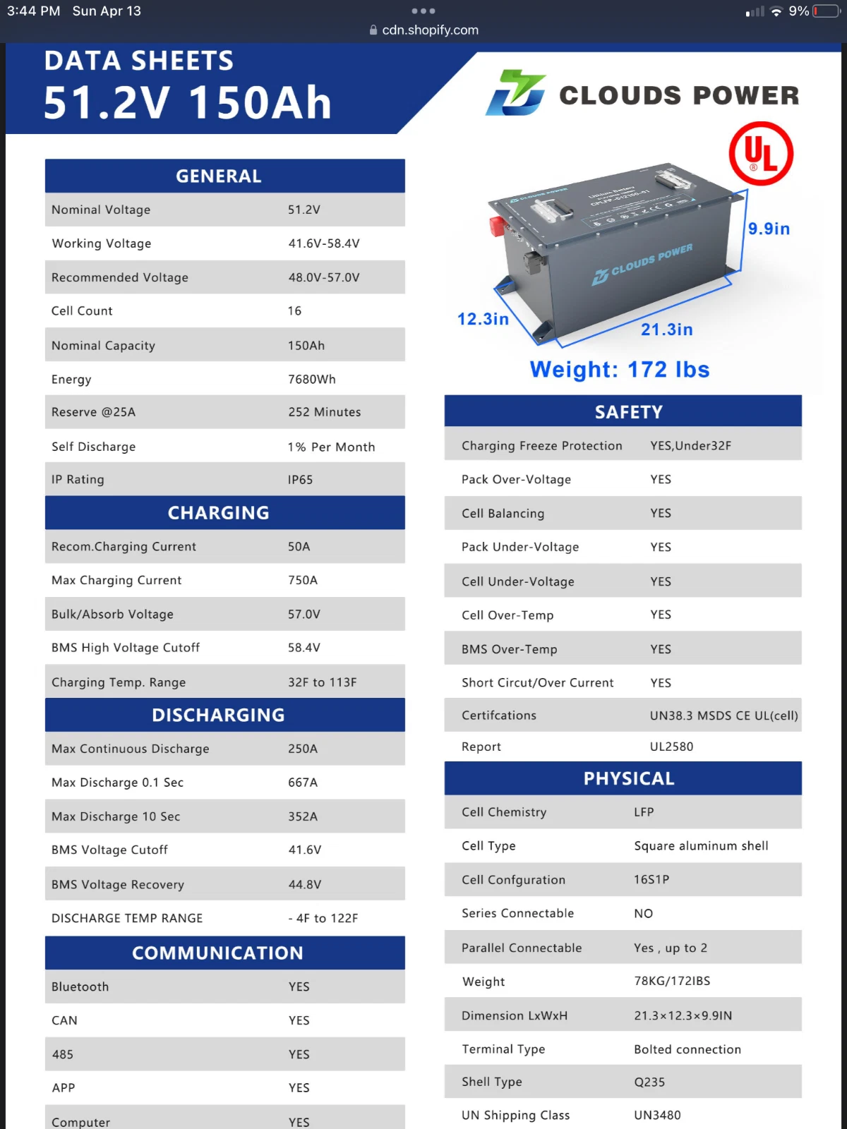 Fully charged 48V 50ah LiFePO4 Lithium Battery can support 2560Wh energy for your appliances. It weighs only 40.3 lbs, only 1/3 of the weight of a 12V 100Ah AGM SLA Battery. It makes installation and movement more easier.